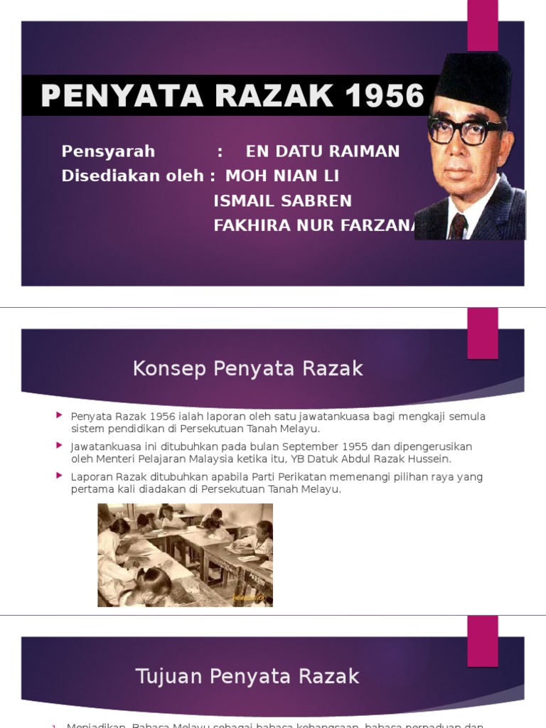 Penyata Razak 1956 Penyata Razak 1956 merupakan cadangan-cadangan yang dibuat oleh satu jawatankuasa oleh kerajaan Malaysia bagi mengkaji semula sistem pendidikan di Malaysia. PowToon is a free. Matlamat beliau adalah untuk membentuk semula sistem pendidikan di Malaya.