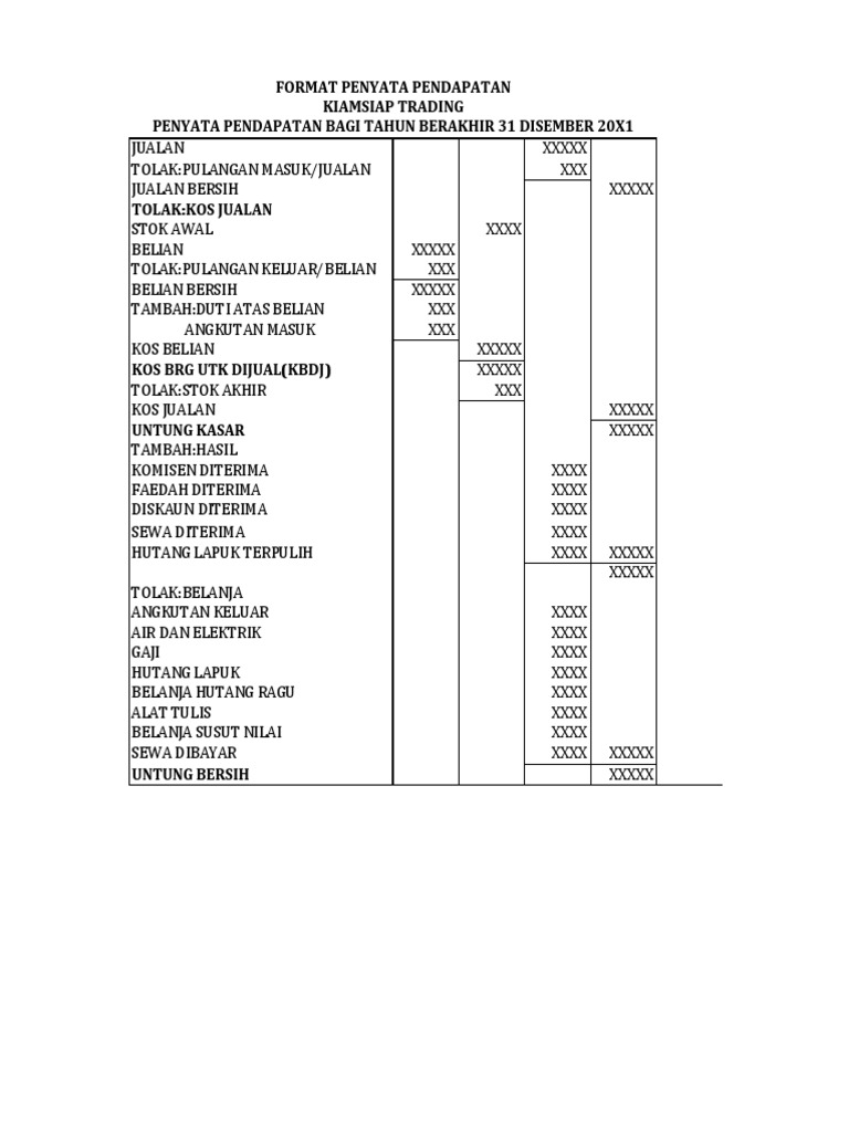 View flipping ebook version of MODUL PERNIAGAAN TINGKATAN 5 published by Ummi Merak Kayangan on 2020-10-28. Menerangkan secara ringkas format penyata pendapatan bagi pelajar yang mengambil subjek perniagaan. A Akaun Perdagangan dan Akaun Untung Rugi bagi setengah tahun berakhir 31 Disember 1997 dan Kunci Kira-kira pada tarikh tersebut.