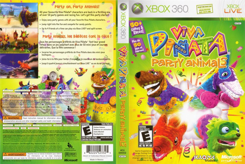 Description Based on the 4Kids Rare and Microsoft Viva Piñata franchise Party Animals lets players compete in over 50 different mini-games and races framed in a game show like Fuzion Frenzy 2Featuring a cast of eight different characters you can choose your favorite alter ego as you battle your way through contests to reach maximum candiosity. Party Animals is instead a minigame. Partake in family style fun with the Viva Piñata.