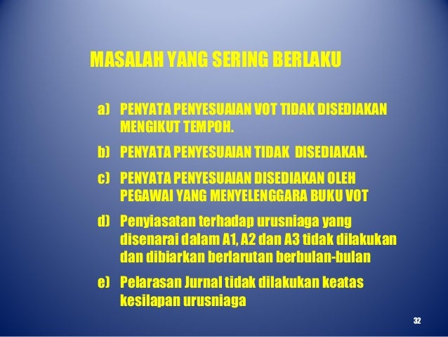 Penyata penyesuaian vot igfmas. Memastikan penyata perbelanjaan bulanan dan tahunan disahkan. Lengkapkan Format Penyata Penyesuaian Baki Aset Alih. Matlamat Penyesuaian Vot Dapat membantu mengawal perbelanjaan dan peruntukan Memudahkan membuat laporan bulanan kepada Pegawai Pengawal Memudahkan menyediakan penutupan akaun akhir tahun Mengelakkan kuiri Audit 32.